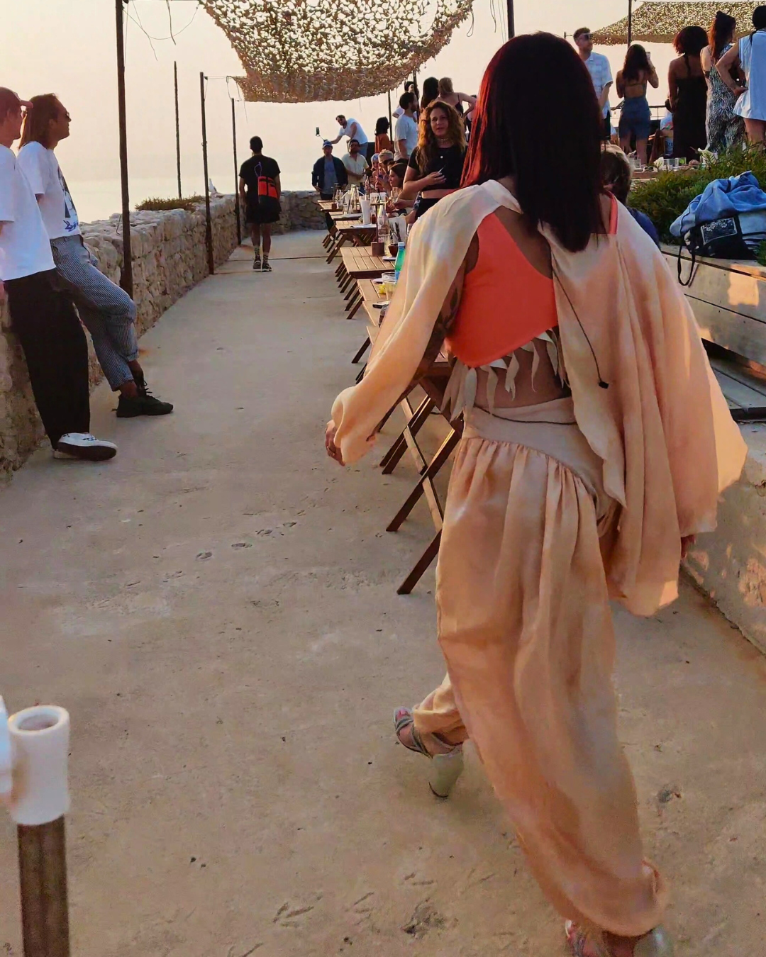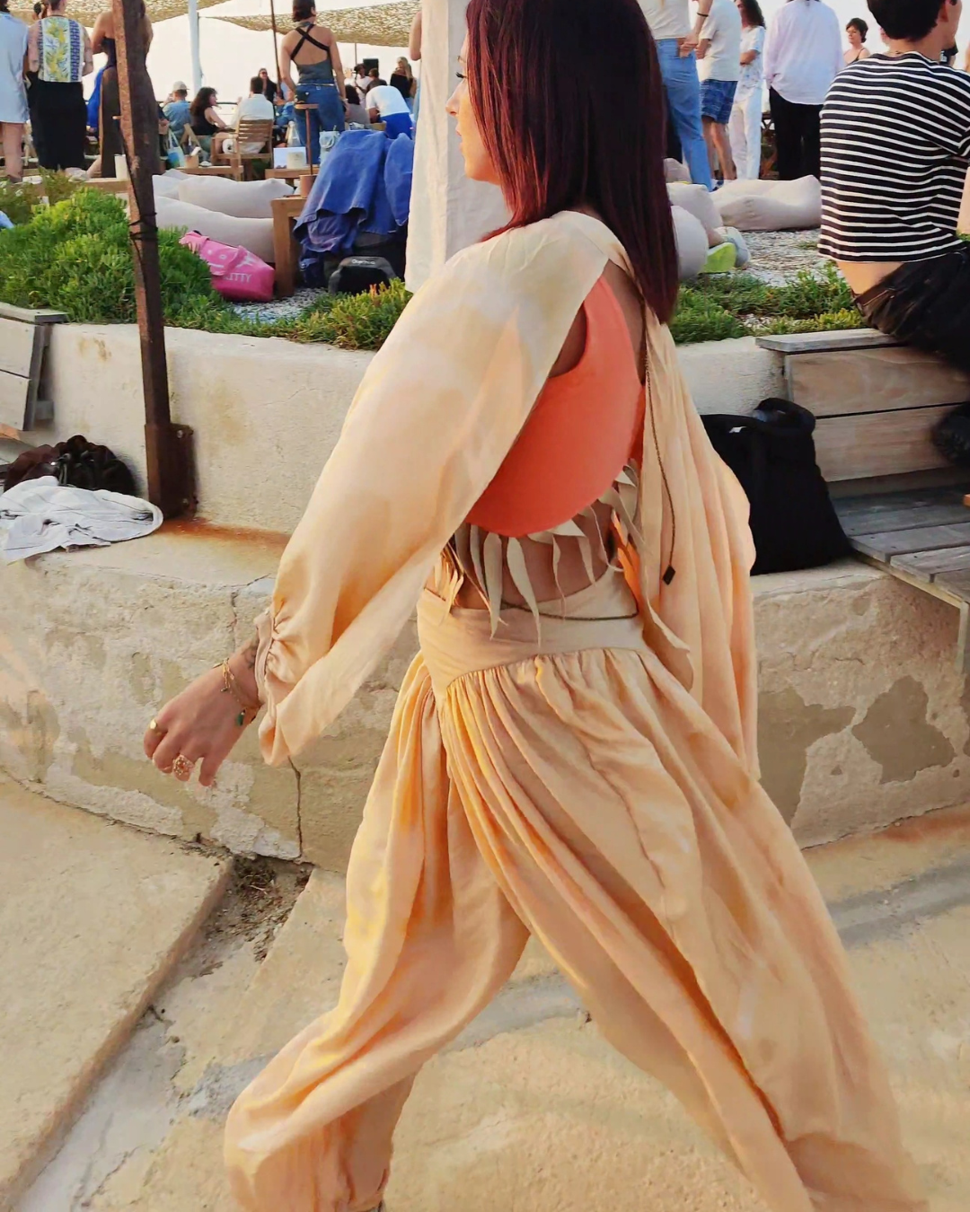 Créee pour le défilé, la cape-bijou complète ce look solaire