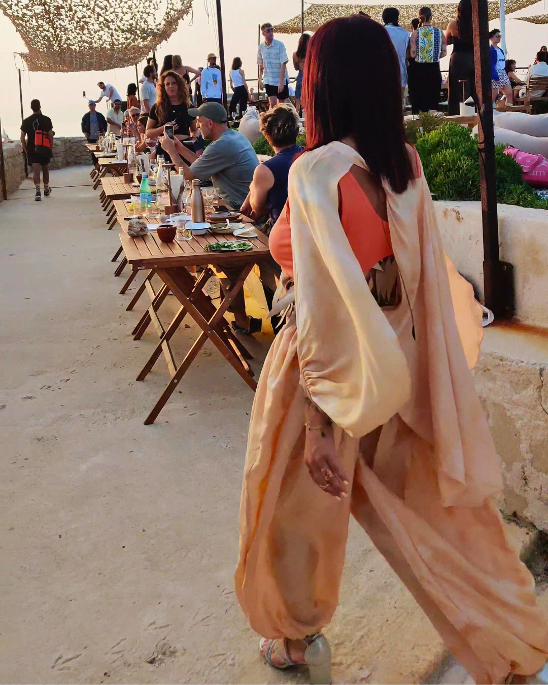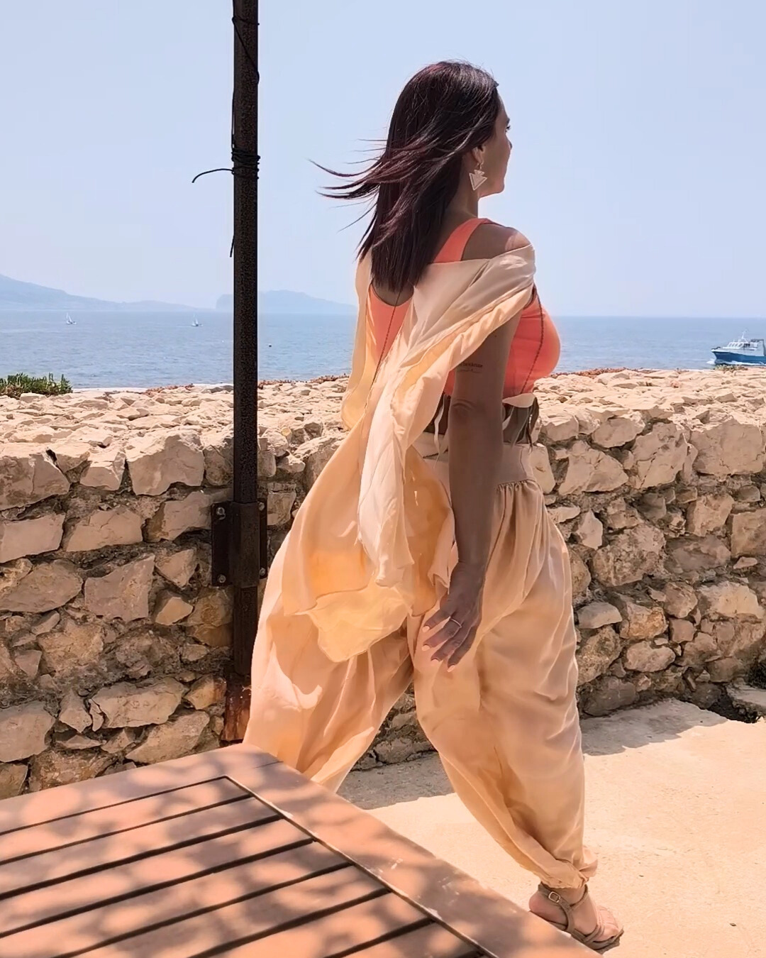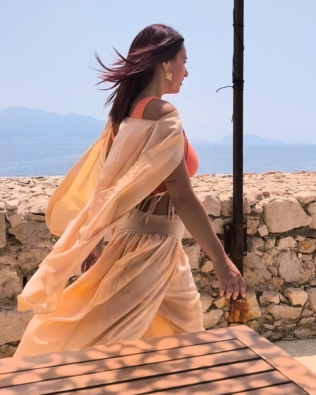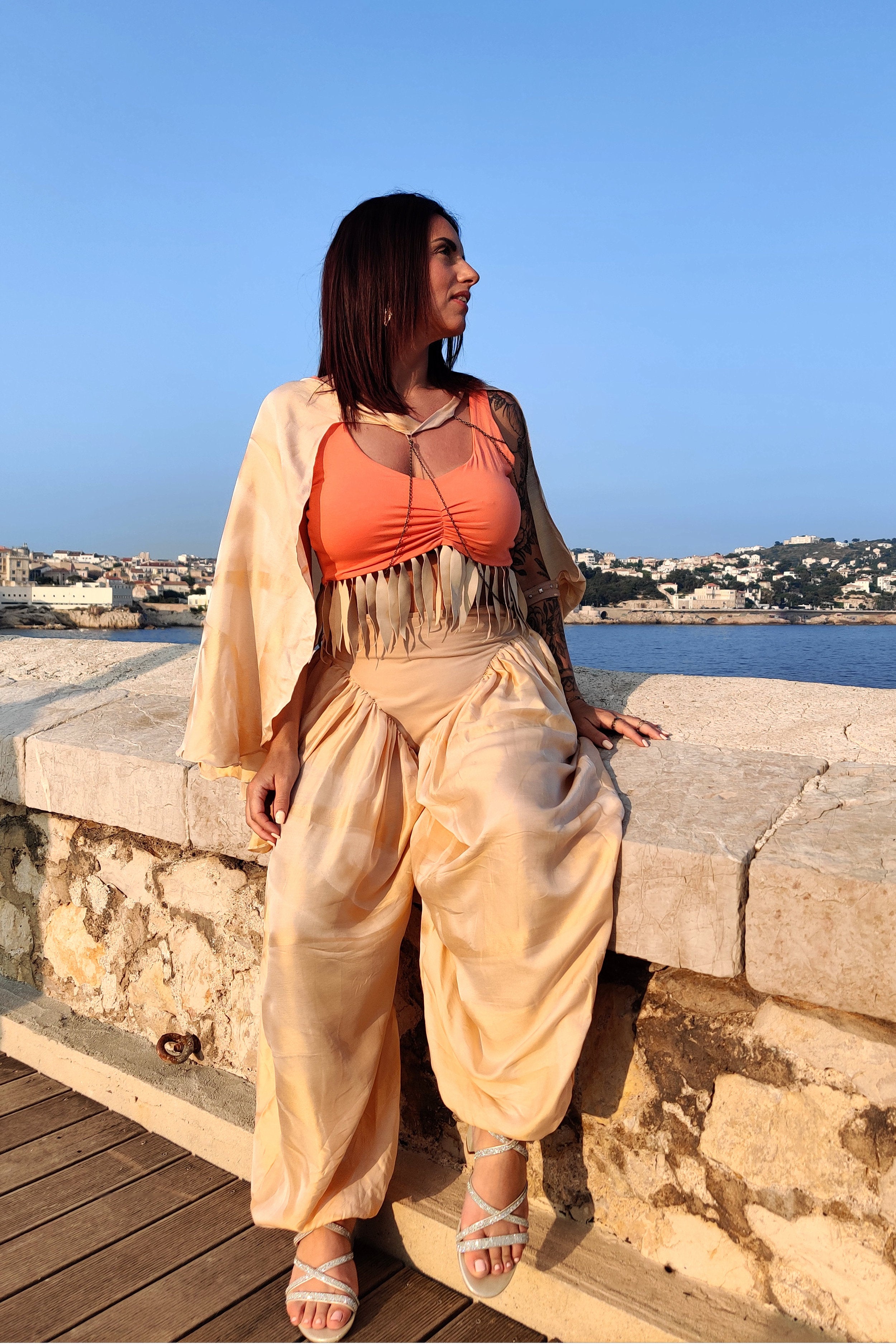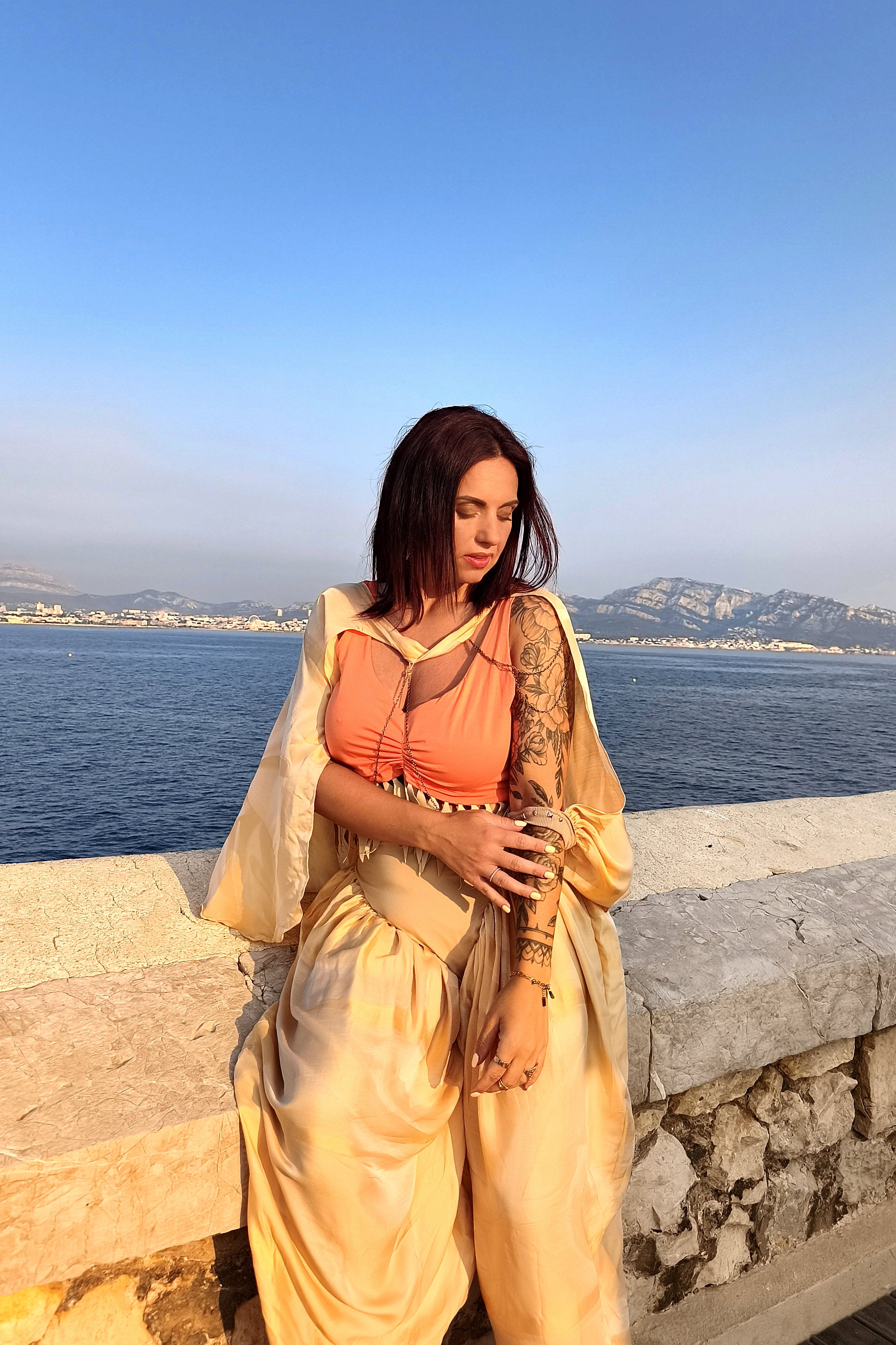 Pensée pour la scène, les cérémonies ou simplement pour se sentir souveraine, cette cape raconte une féminité libre, solaire et précieuse.
