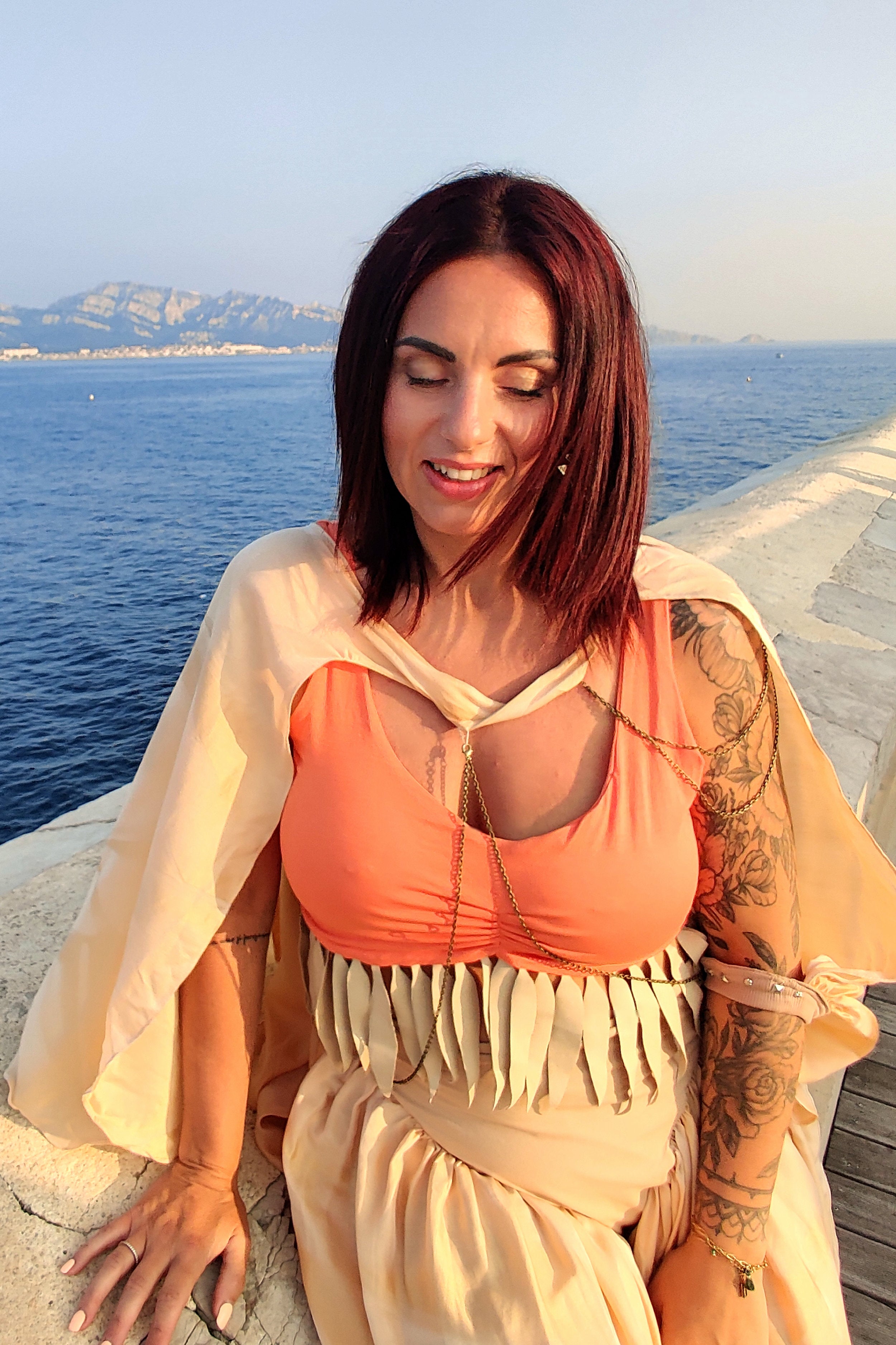 ✨ Détail signature : un travail de chaînes de laiton doré-rosé, délicatement cousues à la main, qui ornent l’avant, l’épaule et le dos — comme un bijou porté à même la peau.