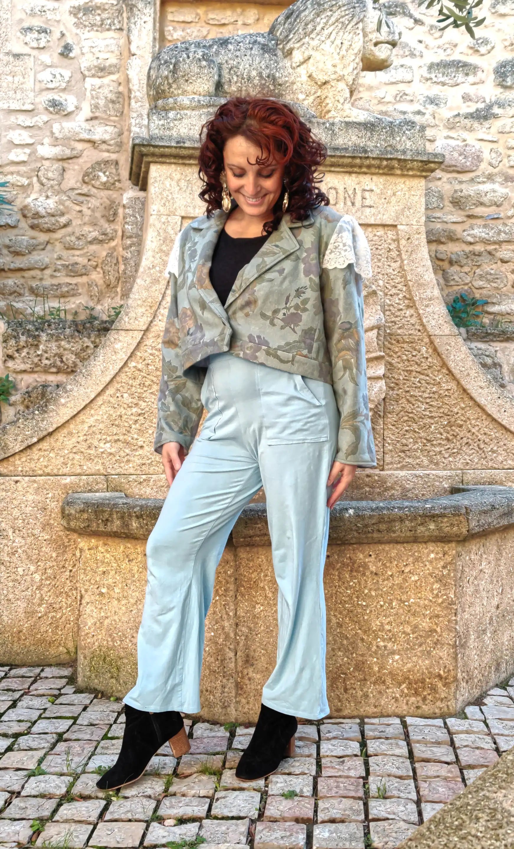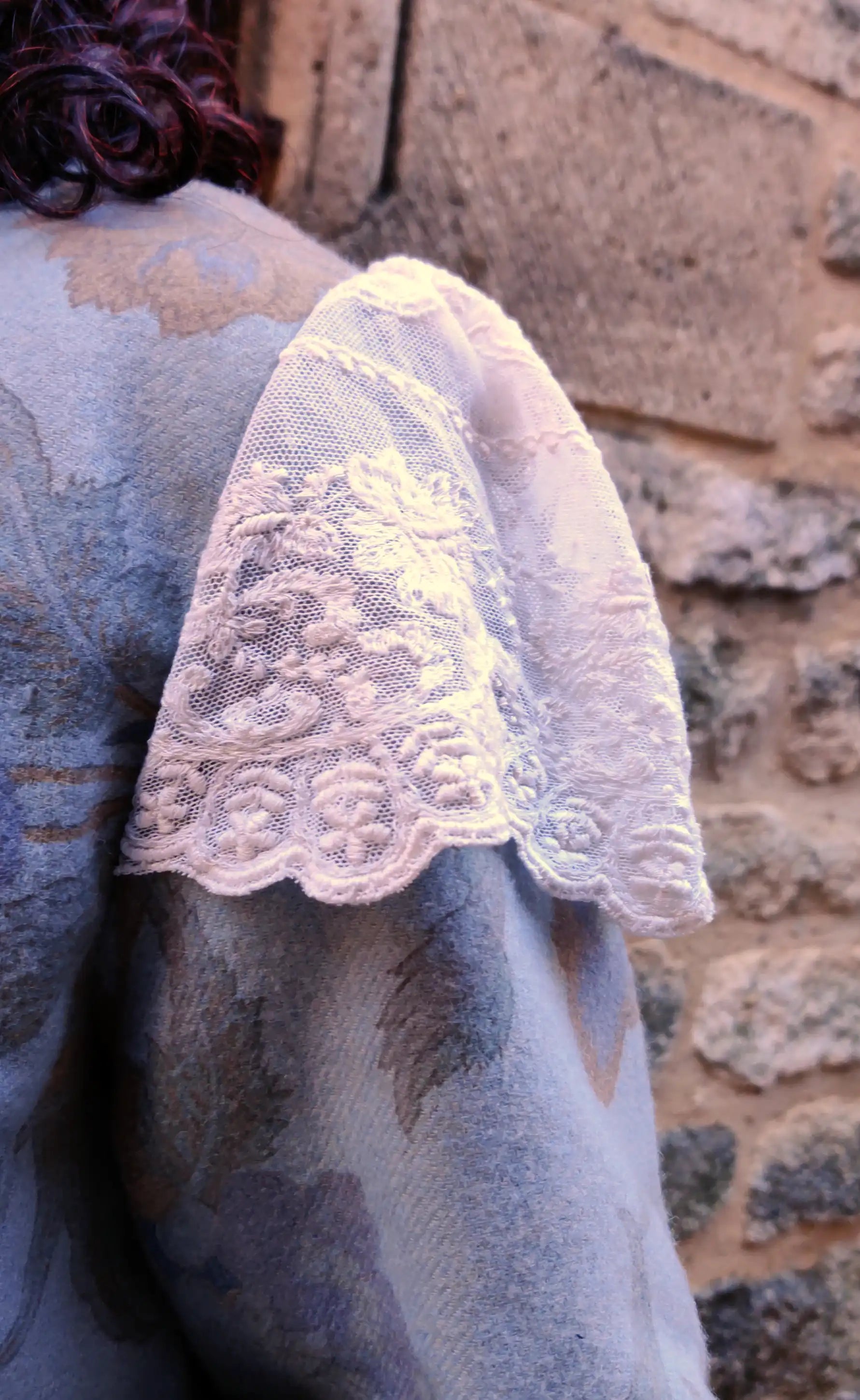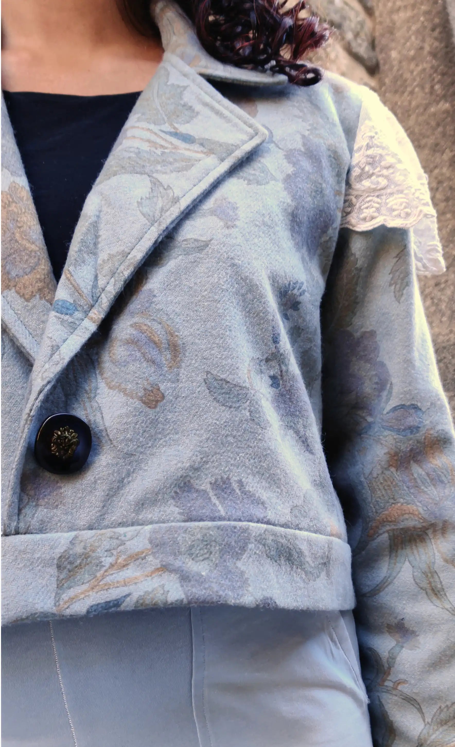 L’ajout de dentelle de coton aux épaules crée un effet structuré et ajusté, typique d’une veste tailleur classique. Un bouton vintage, unique et chiné, ferme la veste (le modèle de bouton peut varier en fonction du stock disponible )