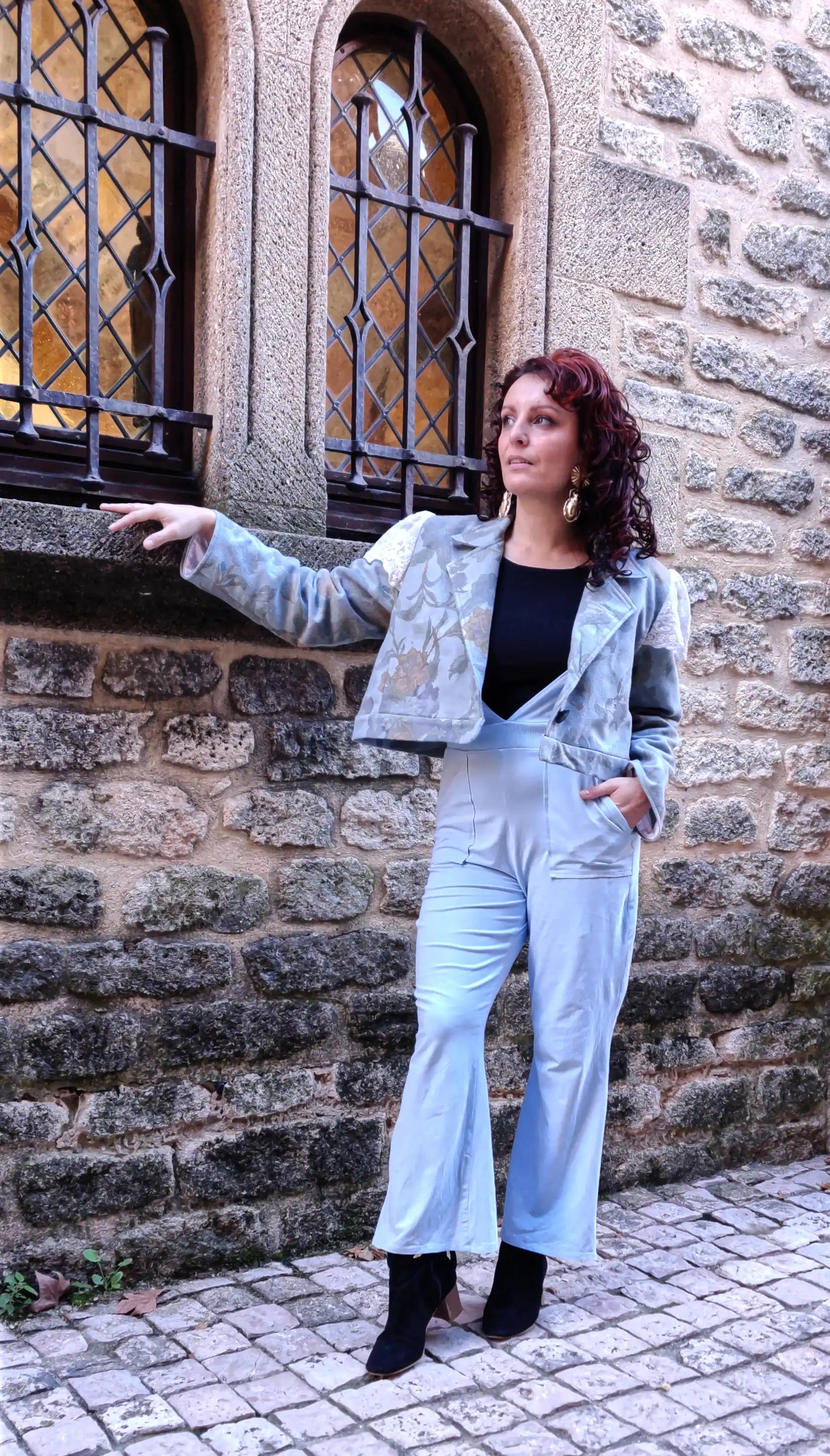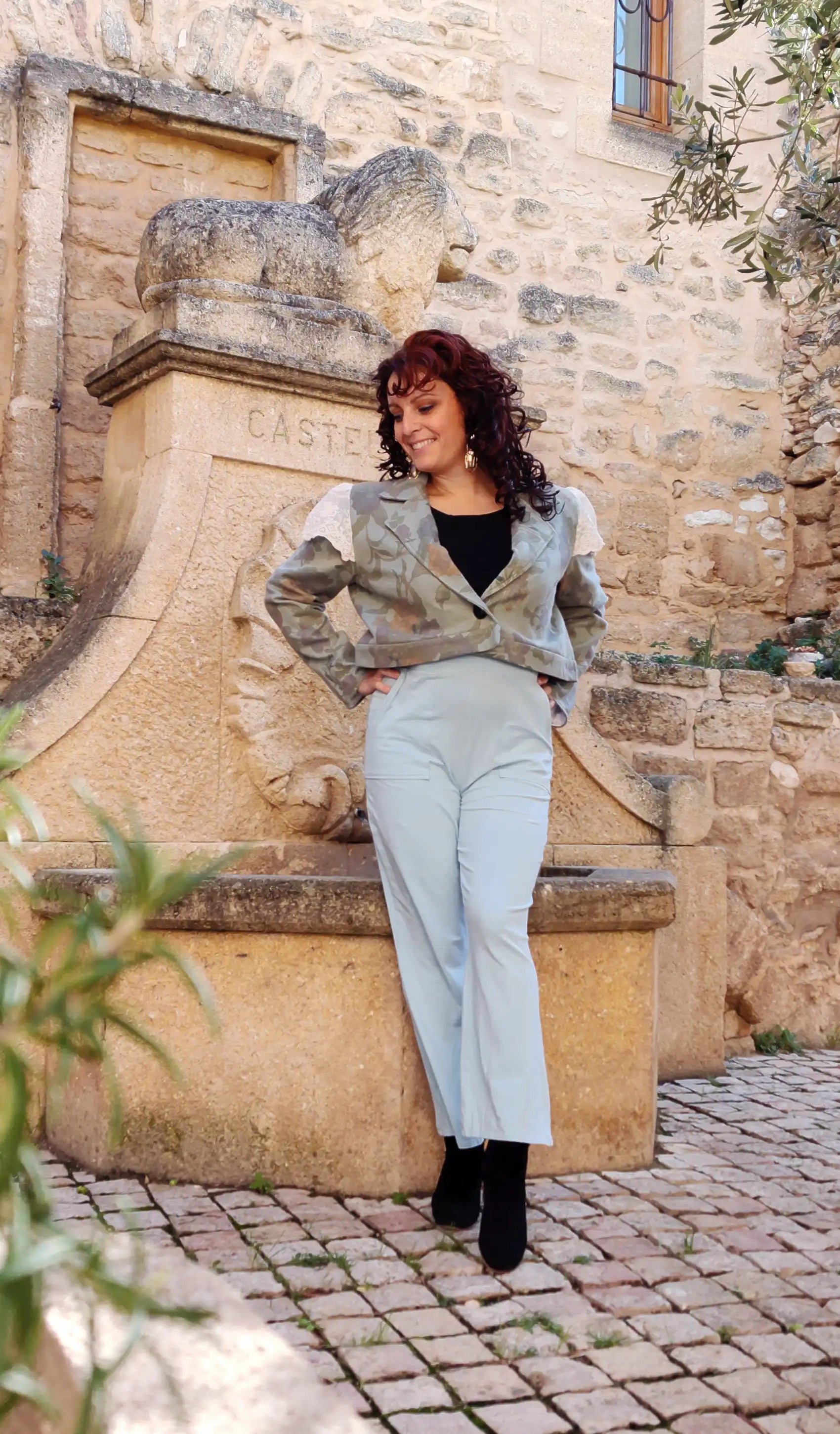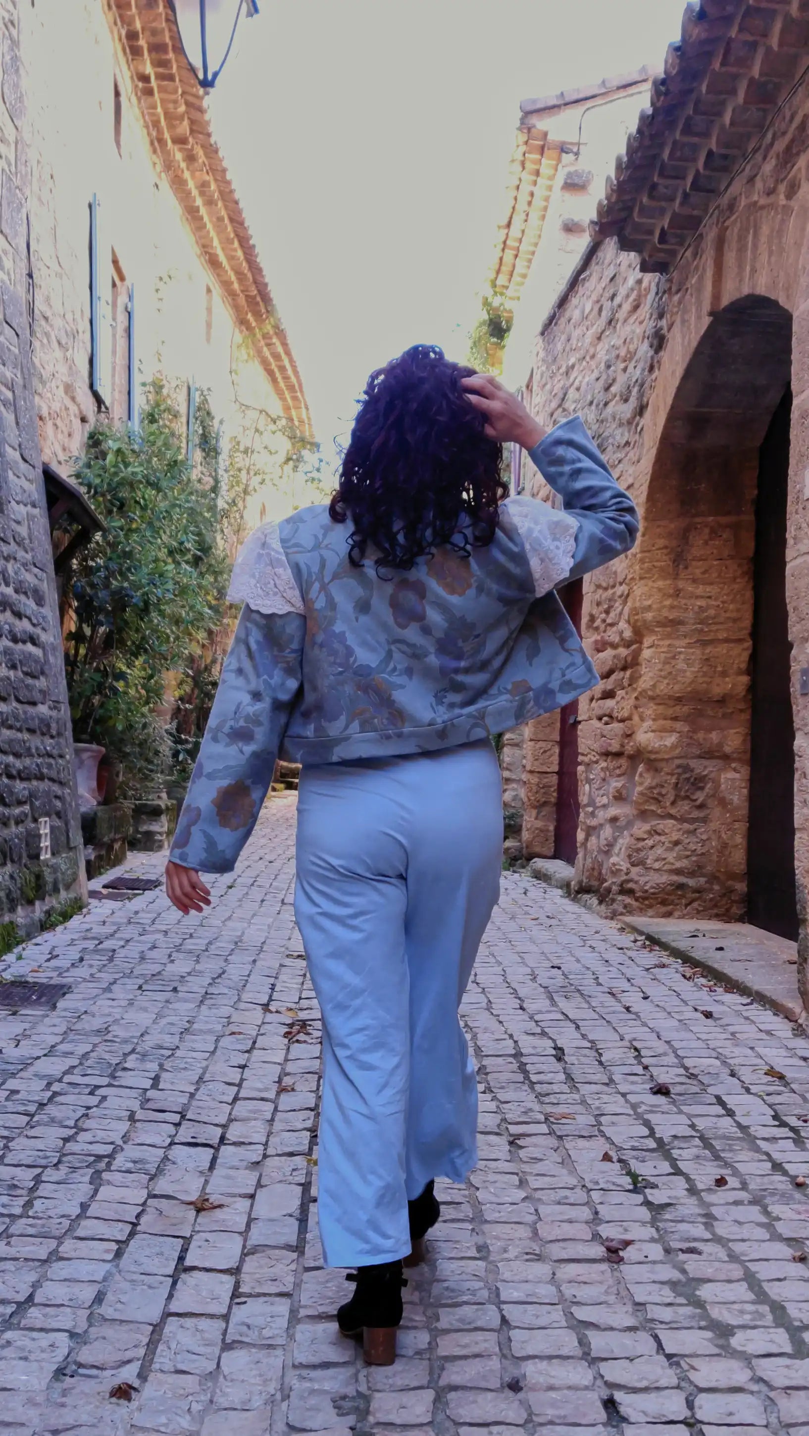 L’ajout de dentelle de coton aux épaules crée un effet structuré et ajusté, typique d’une veste tailleur classique. Un bouton vintage, unique et chiné, ferme la veste (le modèle de bouton peut varier en fonction du stock disponible )